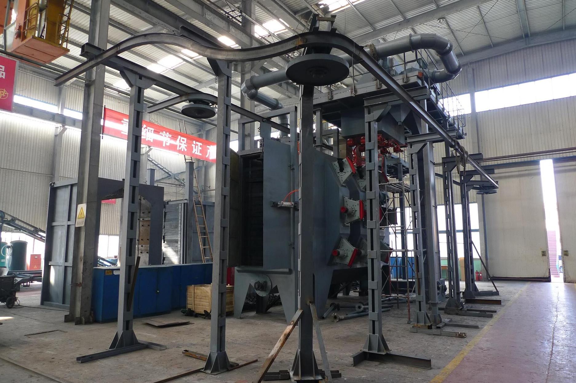 工件在吊具的吊裝下進入拋丸清理室,當進入拋丸清理區(qū)后,懸鏈自動停止,同時大門關閉,工件在自轉機構的驅動下自轉,同時拋丸器對工件進行拋丸清理,清理完畢,彈丸控制器停止供丸,大門打開,工件在懸鏈輸送系統(tǒng)的驅動下被輸送出拋丸清理室,同時下一組鉤吊裝的工件被輸送進拋丸清理室,重復以上過程,對工件進行高效率的拋丸清理。